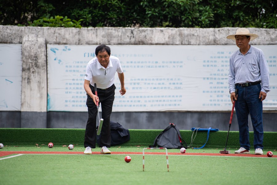 Residentes juegan al croquet en un centro geriátrico en el poblado de Guiping del distrito de Dingcheng, en la provincia central china de Hunan, el 27 de abril de 2022. (Xinhua/Chen Sihan)