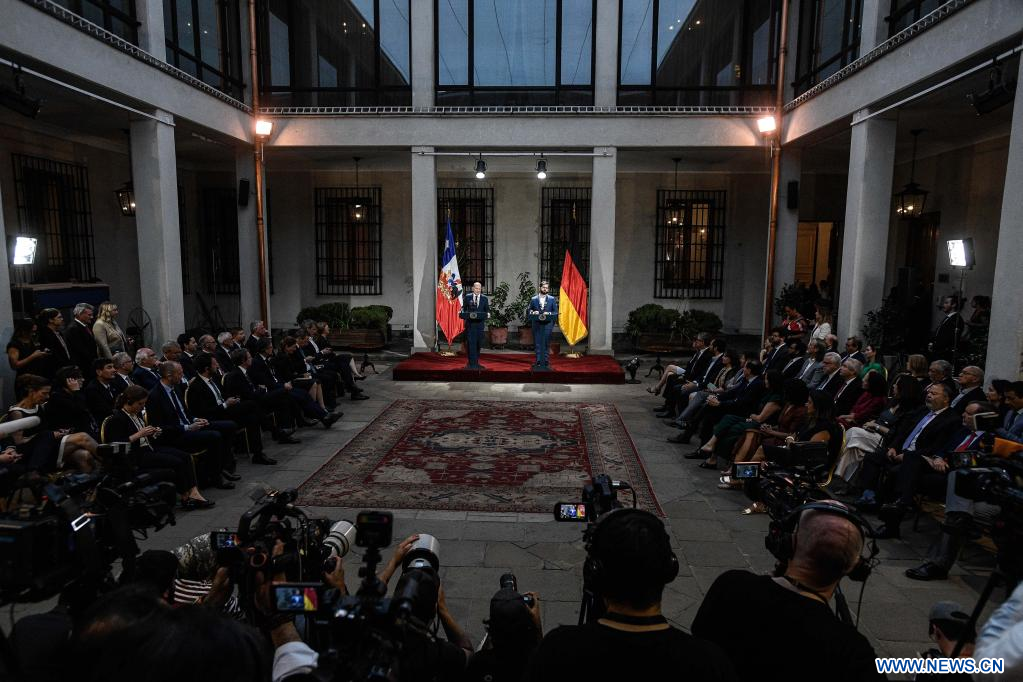 SANTIAGO, 30 enero, 2023 (Xinhua) -- Imagen del 29 de enero de 2023 del presidente chileno, Gabriel Boric (d-atrás), y el canciller alemán, Olaf Scholz (i-atrás), asistiendo a una conferencia de prensa en el Palacio de La Moneda, en Santiago, Chile. Chile y Alemania avanzaron en acuerdos de cooperación sobre tecnología, minería y economía, afirmó el domingo el presidente de Chile, Gabriel Boric, durante la visita de Estado del canciller de Alemania, Olaf Scholz, al país sudamericano. (Xinhua/Jorge Villegas)