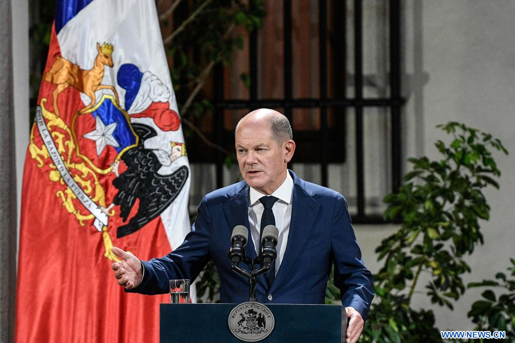 SANTIAGO, 30 enero, 2023 (Xinhua) -- Imagen del 29 de enero de 2023 del canciller alemán, Olaf Scholz, hablando durante una conferencia de prensa en el Palacio de La Moneda, en Santiago, Chile. Chile y Alemania avanzaron en acuerdos de cooperación sobre tecnología, minería y economía, afirmó el domingo el presidente de Chile, Gabriel Boric, durante la visita de Estado del canciller de Alemania, Olaf Scholz, al país sudamericano. (Xinhua/Jorge Villegas)