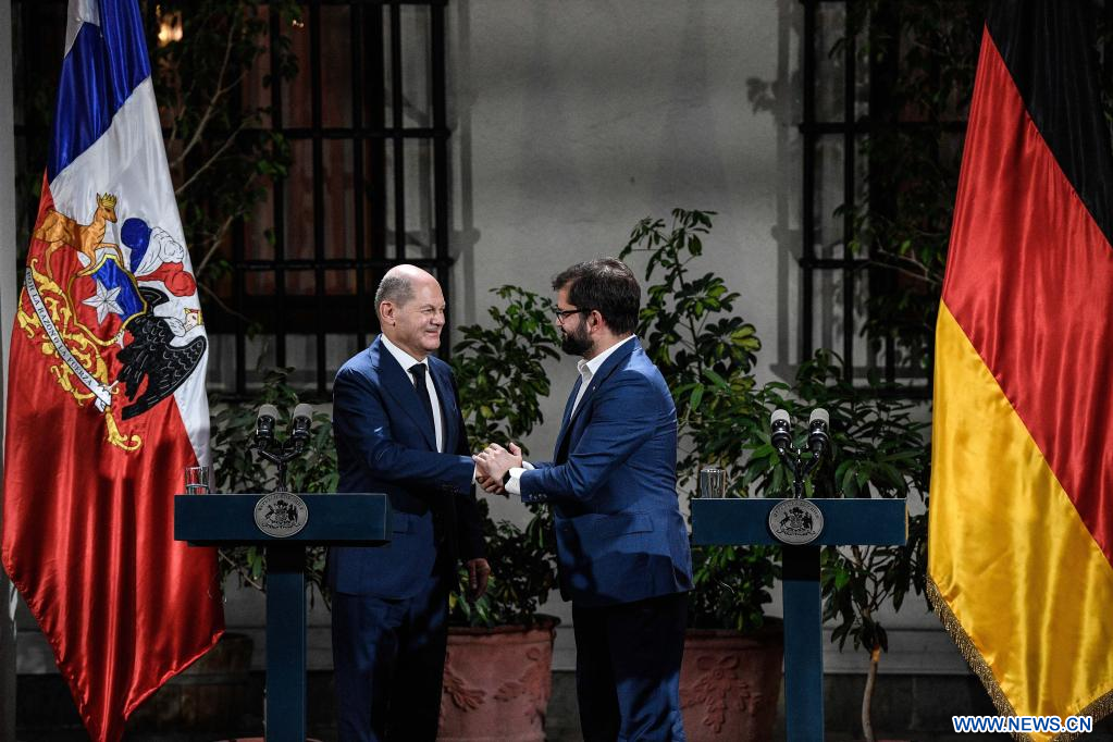 SANTIAGO, 30 enero, 2023 (Xinhua) -- Imagen del 29 de enero de 2023 del presidente chileno, Gabriel Boric (d), y el canciller alemán, Olaf Scholz (i), estrechando las manos después de una conferencia de prensa en el Palacio de La Moneda, en Santiago, Chile. Chile y Alemania avanzaron en acuerdos de cooperación sobre tecnología, minería y economía, afirmó el domingo el presidente de Chile, Gabriel Boric, durante la visita de Estado del canciller de Alemania, Olaf Scholz, al país sudamericano. (Xinhua/Jorge Villegas)