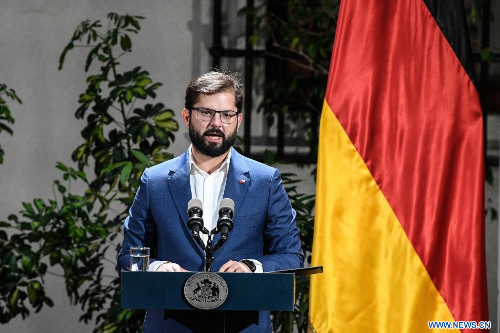 SANTIAGO, 30 enero, 2023 (Xinhua) -- Imagen del 29 de enero de 2023 del presidente chileno, Gabriel Boric, hablando durante una conferencia de prensa en el Palacio de La Moneda, en Santiago, Chile. Chile y Alemania avanzaron en acuerdos de cooperación sobre tecnología, minería y economía, afirmó el domingo el presidente de Chile, Gabriel Boric, durante la visita de Estado del canciller de Alemania, Olaf Scholz, al país sudamericano. (Xinhua/Jorge Villegas)