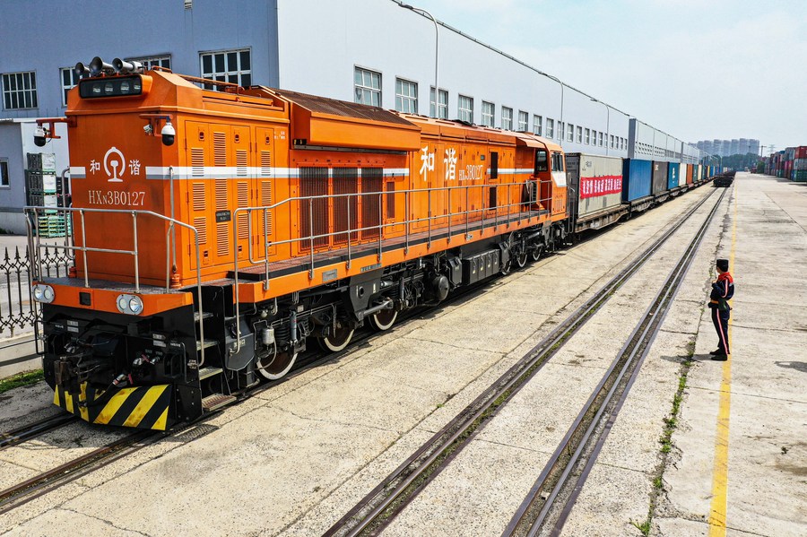 En esta foto aérea, un tren de carga China-Europa está a punto de partir de la estación ferroviaria de Shenyang Este en Shenyang, provincia nororiental china de Liaoning, el 16 de junio de 2022 (Xinhua/Yang Qing)