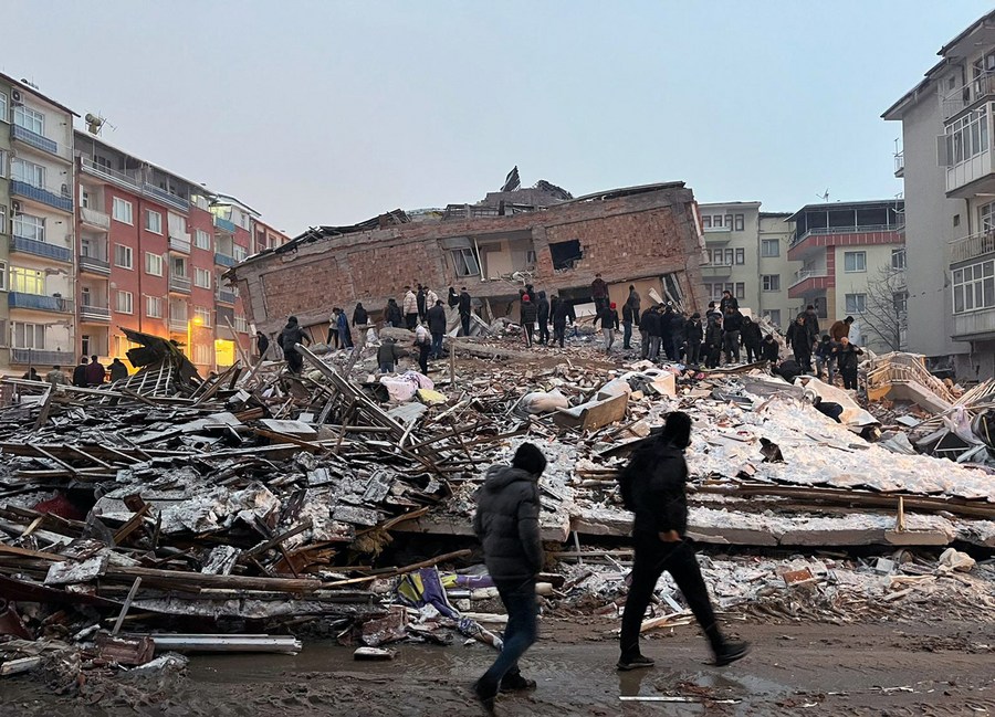 Personas revisan edificios dañados después de los terremotos, en Malatya, Turquía, el 6 de febrero de 2023. (Xinhua/Mustafa Kaya)