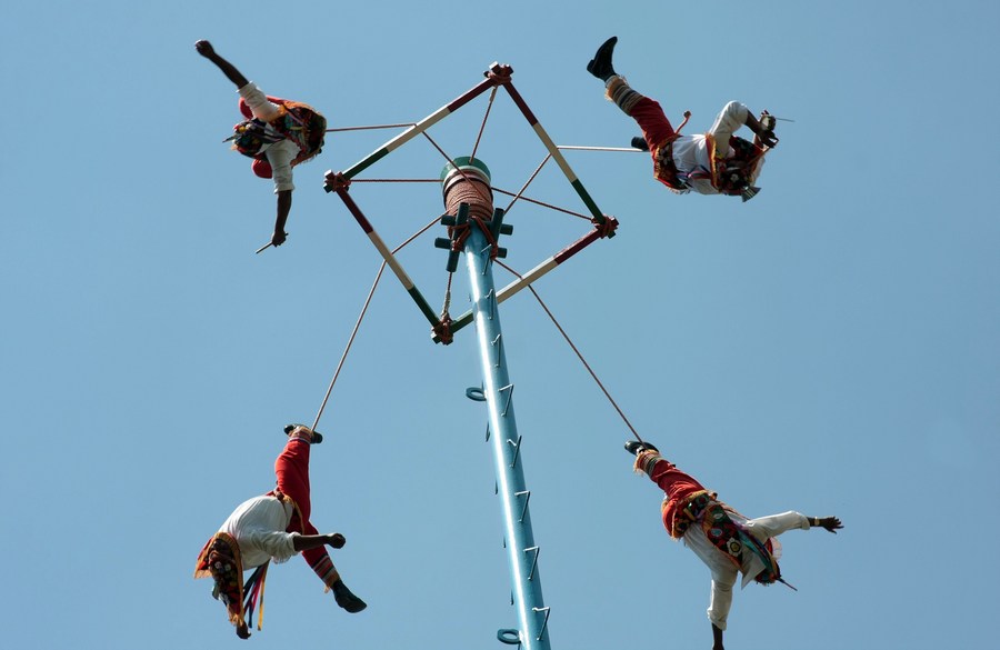Imagen del 3 de octubre de 2009 de los "Voladores de Papantla" realizando una presentación en la Ciudad de México, la capital mexicana. (Xinhua/Pool Contreras)