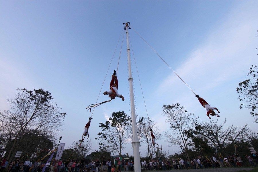 Integrantes de los "Voladores de Papantla" participan en la ceremonia inaugural de la 16ª edición de la "Cumbre Tajín, el trayecto de nuestra luz", en el Parque Temático Takilhsukut, en Papantla de Olarte, en el estado mexicano de Veracruz, el 19 de marzo de 2015. (Xinhua/Gustavo Durán/Notimex)