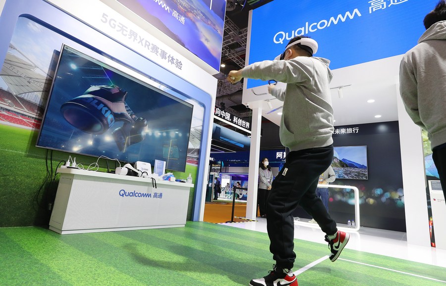 Un visitante practica un deporte con un dispositivo de realidad virtual, en la zona de exhibición de Industria Inteligente y Tecnología Informática de la V Exposición Internacional de Importación de China (CIIE, siglas en inglés), en el Centro Nacional de Exhibiciones y Convenciones de Shanghai, este de China, el 5 de noviembre de 2022. (Xinhua/Fang Zhe)