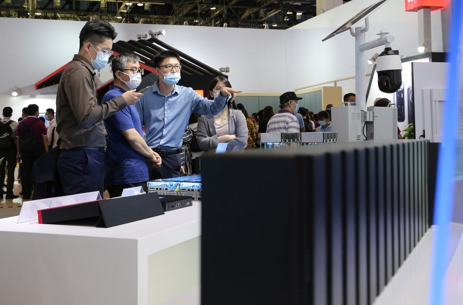 Un grupo de personas visita el estand de Huawei en el área de exposición general de la Feria Internacional de Comercio de Servicios de China 2020 (CIFTIS, por sus siglas en inglés), en Beijing, capital de China, el 8 de septiembre de 2020. (Xinhua/Pan Siwei)