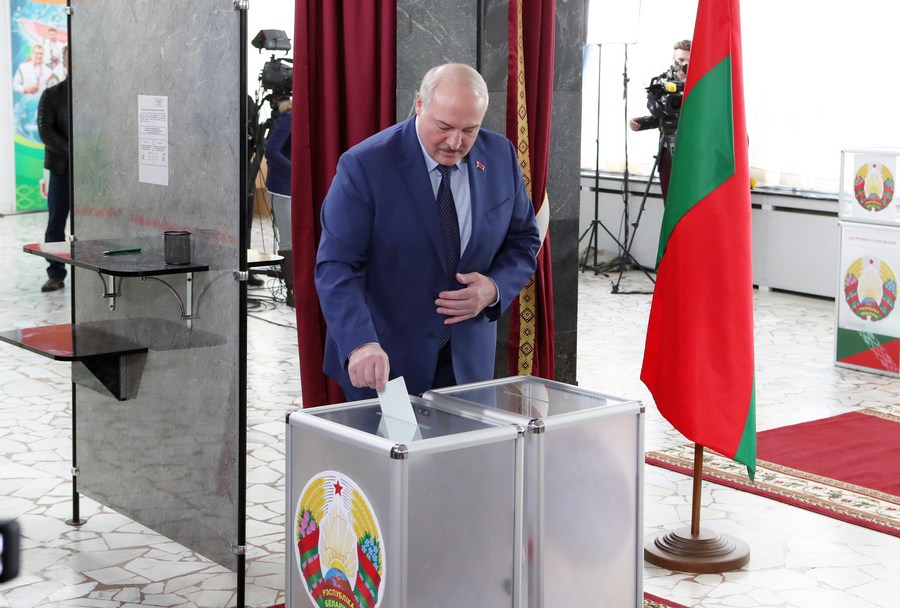 El presidente bielorruso, Alexander Lukashenko, emite su voto en un centro electoral, en Minsk, capital de Bielorrusia, el 27 de febrero de 2022. (Xinhua/Henadz Zhinkov)