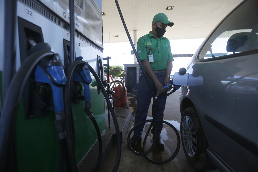 Un trabajador abastece de combustible un vehículo en una estación de servicio de la compañía Petrobras, en Brasilia, Brasil, el 9 de marzo de 2022. (Xinhua/Lucio Tavora)