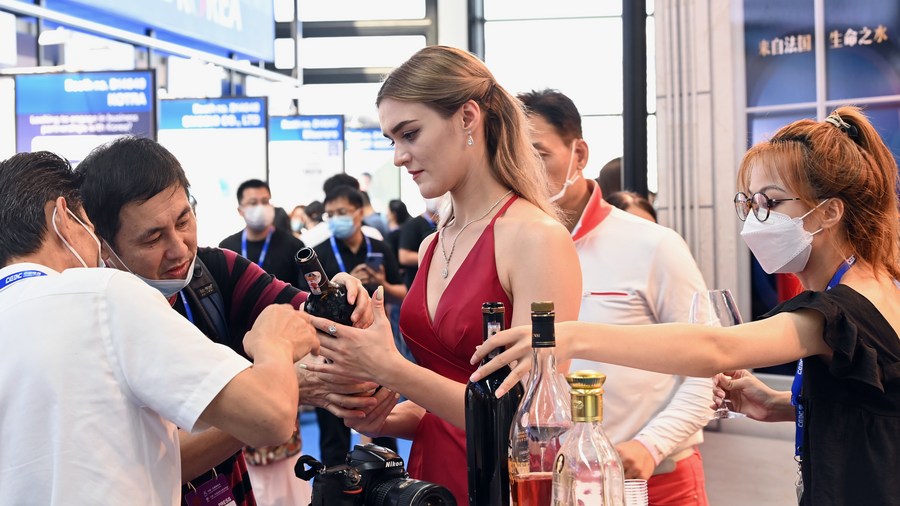Visitantes degustan productos vinícolas de Francia en el pabellón internacional de la Franja y la Ruta durante la 19ª Exposición China-ASEAN en Nanning, región autónoma de la etnia zhuang de Guangxi, en el sur de China, el 18 de septiembre de 2022. (Xinhua/Zhang Ailin)