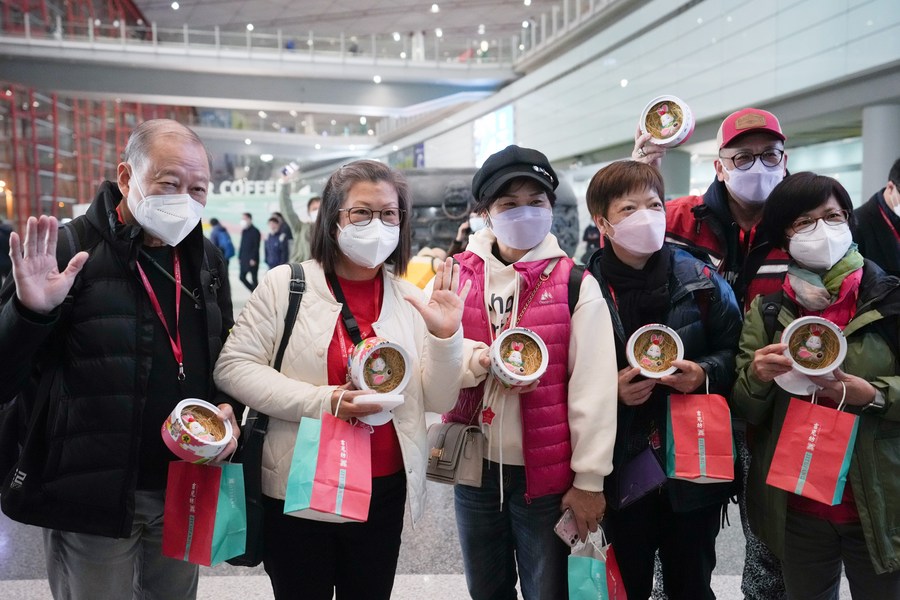 Turistas del primer grupo turístico de Hong Kong posan para una foto con recuerdos en sus manos en el Aeropuerto Internacional Capital de Beijing, la capital de China, el 6 de febrero de 2023. (Xinhua/Ju Huanzong)