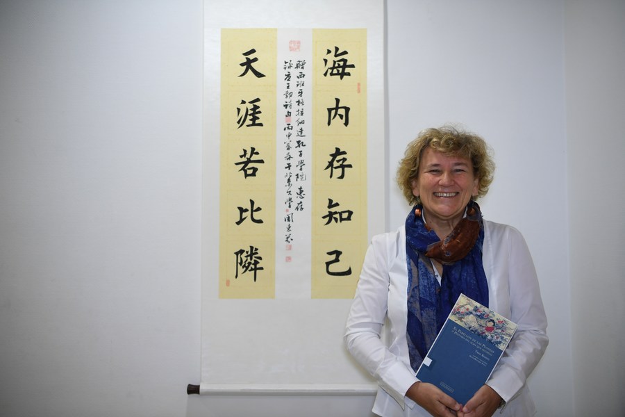 Imagen del 13 de noviembre de 2018 de la directora del Instituto Confucio de la Universidad de Granada, Alicia Relinque, sosteniendo su trabajo de traducción, El Pabellón de las Peonías, de Tang Xianzu, en el Instituto Confucio de la Universidad de Granada, en Granada, España. (Xinhua/Guo Qiuda)