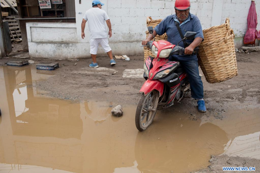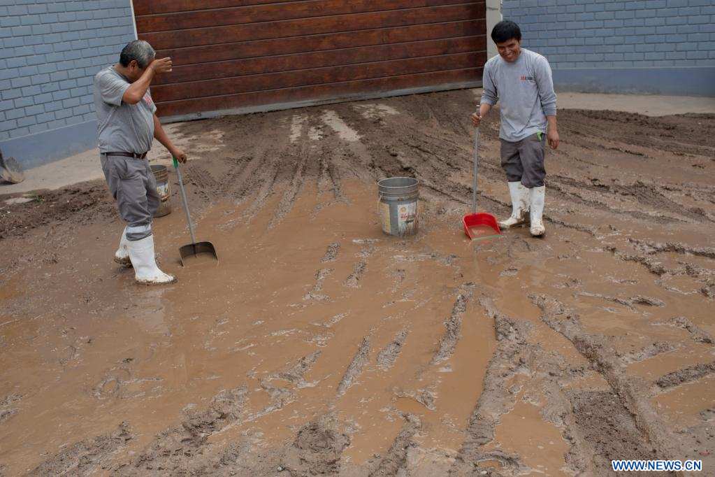 LIMA, 14 marzo, 2023 (Xinhua) -- Personas limpian el lodo en la entrada de una vivienda inundada luego de una lluvia inusual, en el distrito de Lurín, en el sur de Lima, Perú, el 14 de marzo de 2023. El Gobierno de Perú coordina acciones para adoptar "medidas concretas" en Lima y en todas las regiones afectadas por las lluvias e inundaciones por el ciclón Yaku, dijo el lunes el presidente del Consejo de Ministros, Alberto Otárola. (Xinhua/Mariana Bazo)