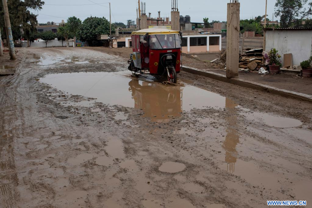 LIMA, 14 marzo, 2023 (Xinhua) -- Un mototaxi circula por una calle inundada luego de una lluvia inusual, en el distrito de Lurín, en el sur de Lima, Perú, el 14 de marzo de 2023. El Gobierno de Perú coordina acciones para adoptar "medidas concretas" en Lima y en todas las regiones afectadas por las lluvias e inundaciones por el ciclón Yaku, dijo el lunes el presidente del Consejo de Ministros, Alberto Otárola. (Xinhua/Mariana Bazo)