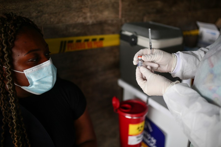 Una trabajadora de la salud muestra una dosis de la vacuna contra la COVID-19 CoronaVac, desarrollada por la farmacéutica china Sinovac, a una mujer, en Bogotá, capital de Colombia, el 22 de septiembre de 2021. (Xinhua/Jhon Paz)