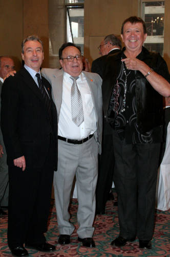 Imagen de archivo de agosto de 2006 del actor y comediante Roberto Gómez Bolaños (c), y los actores César Costa (d) y Xavier López "Chabelo" (i), durante una ceremonia donde el Servicio Postal Mexicano le rindió homenaje a Bolaños, en la Ciudad de México, capital de México. (Xinhua/Francisco Morales/Damm Photo)