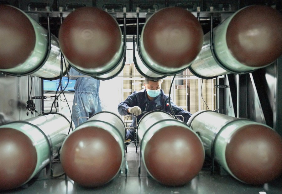 Un obrero ensambla una tubería de gas natural para un vehículo en un taller de la fábrica de nueva energía de Zhengzhou Yutong Bus Co., Ltd. en la ciudad de Zhengzhou, provincia central china de Henan, el 8 de marzo de 2023. (Xinhua/Li An)