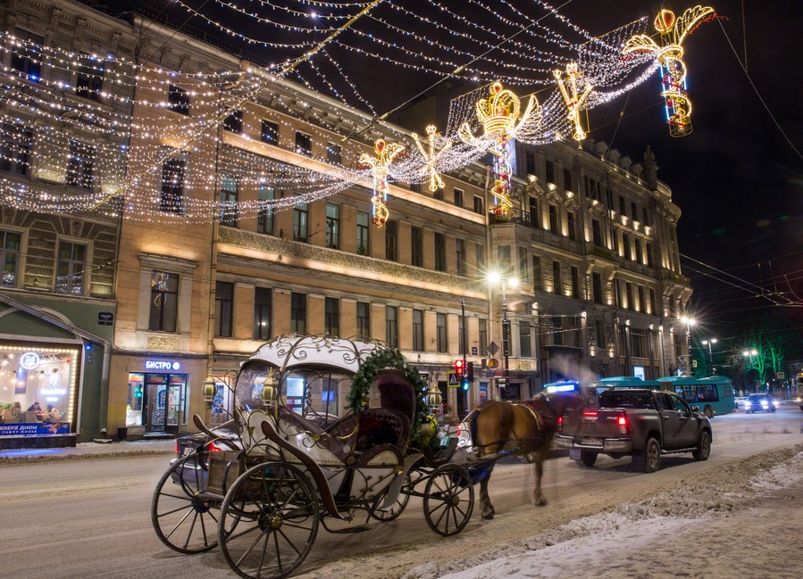Imagen del 24 de diciembre de 2021 de decoraciones luminosas a lo largo de la calle Nevsky Prospect en San Petersburgo, Rusia. (Xinhua/Irina Motina)