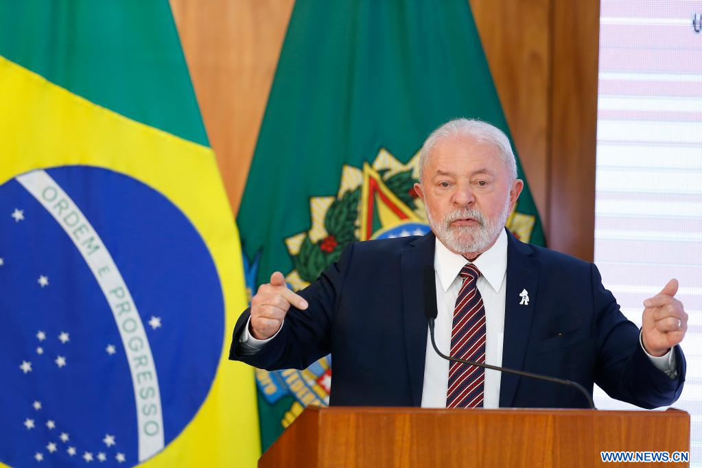El presidente brasileño, Luiz Inácio Lula da Silva, habla durante una reunión ministerial para celebrar los primeros 100 días de su Gobierno en el Palacio de Planalto, en Brasilia, Brasil, el 10 de abril de 2023. Lula da Silva destacó el lunes, con motivo de sus primeros 100 días de gobierno, la recuperación de las políticas sociales, la defensa de la democracia y el medio ambiente, el papel inductor del Estado en la economía, y la apertura del país al mundo. (Xinhua/Lucio Tavora)