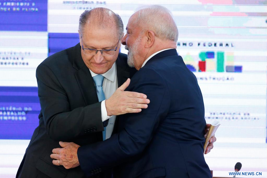 El presidente brasileño, Luiz Inácio Lula da Silva (d), abraza al vicepresidente brasileño, Geraldo Alkimin (i), durante una reunión ministerial para celebrar los primeros 100 días del gobierno de Lula da Silva en el Palacio de Planalto, en Brasilia, Brasil, el 10 de abril de 2023. Lula da Silva destacó el lunes, con motivo de sus primeros 100 días de gobierno, la recuperación de las políticas sociales, la defensa de la democracia y el medio ambiente, el papel inductor del Estado en la economía, y la apertura del país al mundo. (Xinhua/Lucio Tavora)