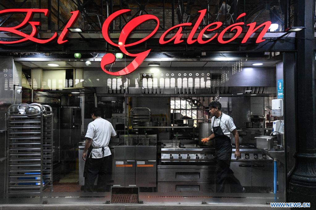 Empleados trabajan en un restaurante en el Mercado Central de Santiago, en Santiago, capital de Chile, el 12 de abril de 2023. El Congreso chileno aprobó el martes un proyecto de ley que obligará a los empleadores chilenos a bajar de 45 a 40 las horas semanales de trabajo en un plazo de cinco años, una de las promesas emblemáticas del Gobierno del presidente Gabriel Boric. (Xinhua/Jorge Villegas)