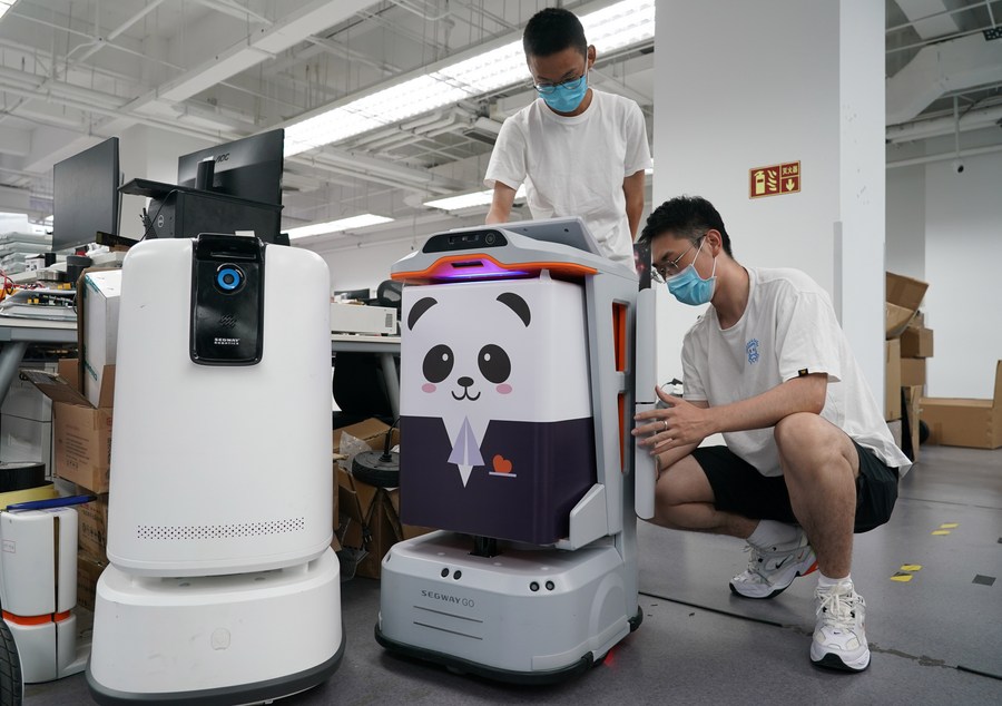 Ingenieros hacen ajustes a un robot de servicio en el parque científico Dongsheng de Zhongguancun, en el distrito de Haidian de Beijing, la capital de China, el 15 de agosto de 2022. (Xinhua/Ren Chao)