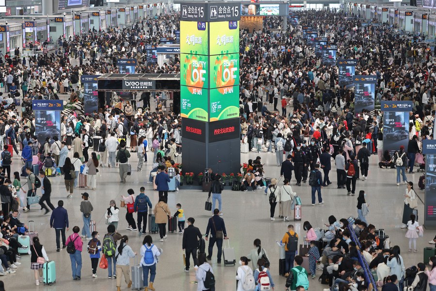 Pasajeros esperan para abordar los trenes en la estación ferroviaria del norte de Xi'an en Xi'an, provincia noroccidental china de Shaanxi, el 29 de abril de 2023. (Xinhua/Zhang Xin)