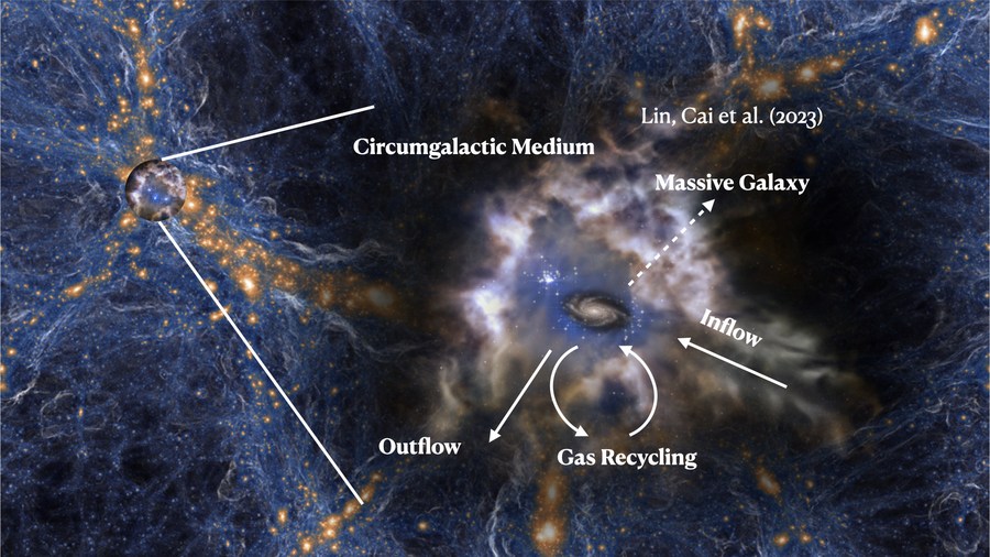 En un análisis más detallado, encontraron que la galaxia está rodeada de gas rico en elementos pesados, que fue expulsado del centro de la misma. El gas enfriado luego fluye de regreso a la galaxia bajo su propia gravedad y las interacciones con las galaxias satélite cercanas, explicó Cai Zheng, experto de la Universidad Tsinghua.
