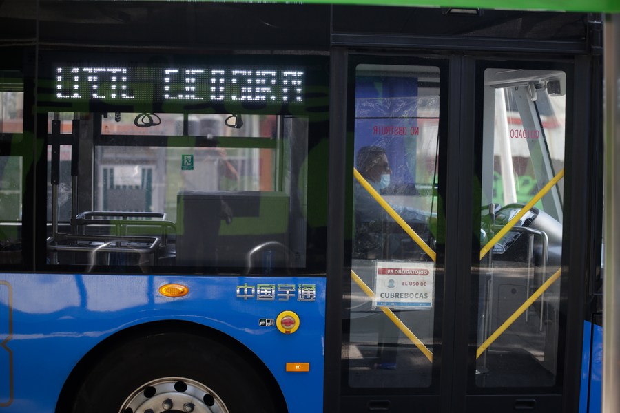 Imagen del 4 de marzo de 2021 de un trolebús fabricado en China circulando por una calle en la Ciudad de México, capital de México. (Xinhua/Francisco Cañedo)
