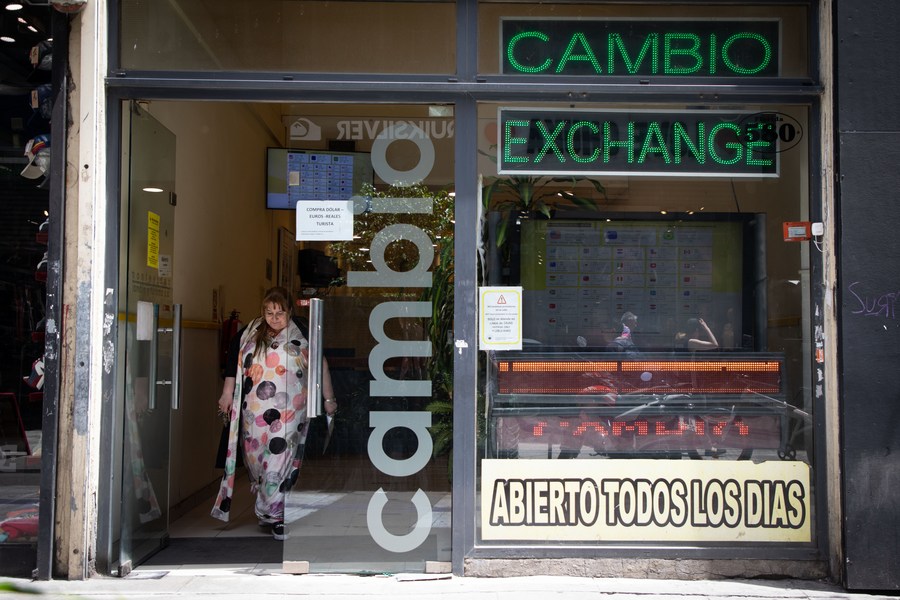 Una mujer sale de un local de venta de divisas, en la ciudad de Buenos Aires, capital de Argentina, el 16 de noviembre de 2022. (Xinhua/Martín Zabala)