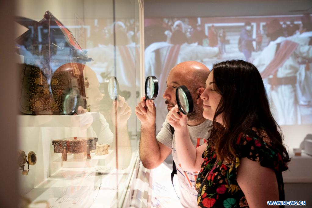 Personas observan con lupas piezas exhibidas en el Museo Nacional de Arte Oriental en el marco del Día Internacional de los Museos, en la ciudad de Buenos Aires, Argentina, el 17 de mayo de 2023. (Xinhua/Martín Zabala)
