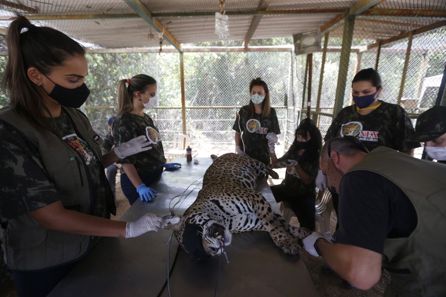 Imagen del 19 de septiembre de 2020 de personas dando un tratamiento de curación a una jaguar hembra adulta, rescatada de un incendio en el Pantanal, en el Instituto de Preservación y Defensa de Félidos de la Fauna Silvestre Brasileña en Proceso de Extinción, en Corumbá de Goiás, estado de Goiás, Brasil. (Xinhua/Lucio Tavora)