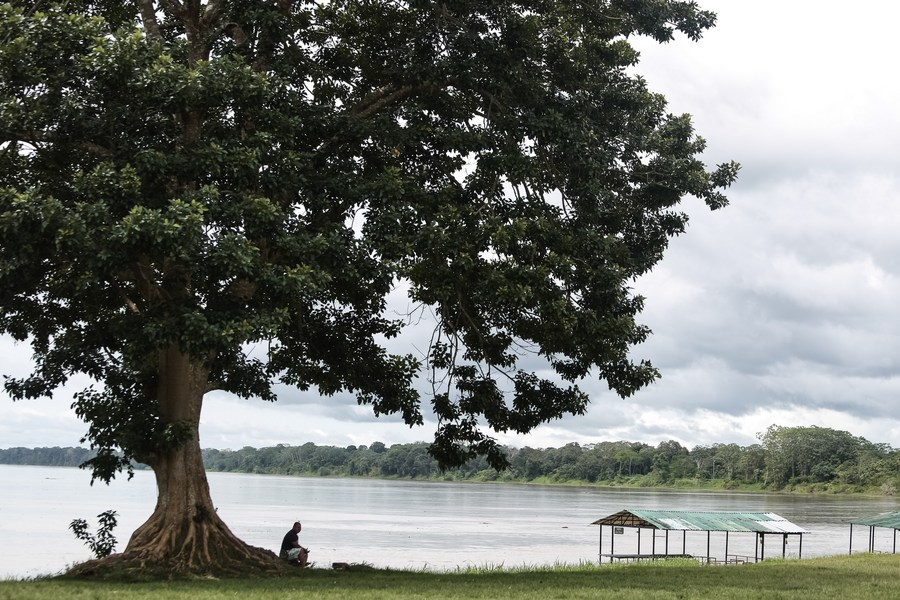 Imagen del 14 de diciembre de 2021 de un hombre descansando frente a un árbol, en el municipio de Puerto Nariño, en el departamento del Amazonas, Colombia. (Xinhua/Jhon Paz)