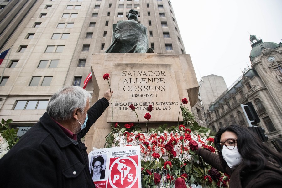 Personas participan en un homenaje al expresidente chileno Salvador Allende en el marco de la conmemoración del 48º aniversario del golpe de Estado del 11 de septiembre de 1973, frente al monumento a Salvador Allende, en Santiago, capital de Chile, el 11 de septiembre de 2021. (Xinhua/Jorge Villegas)