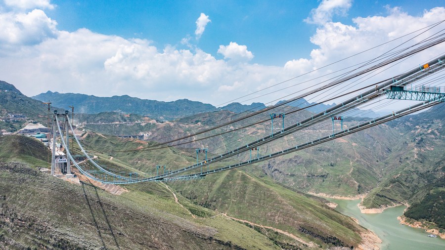 Aspecto del avance de las obras de construcción del gran puente del río Zangke, en la autopista que conecta a Nayong con Qinglong, en la provincia suroccidental china de Guizhou, el 25 de junio de 2023. (Xinhua/Tao Liang)
