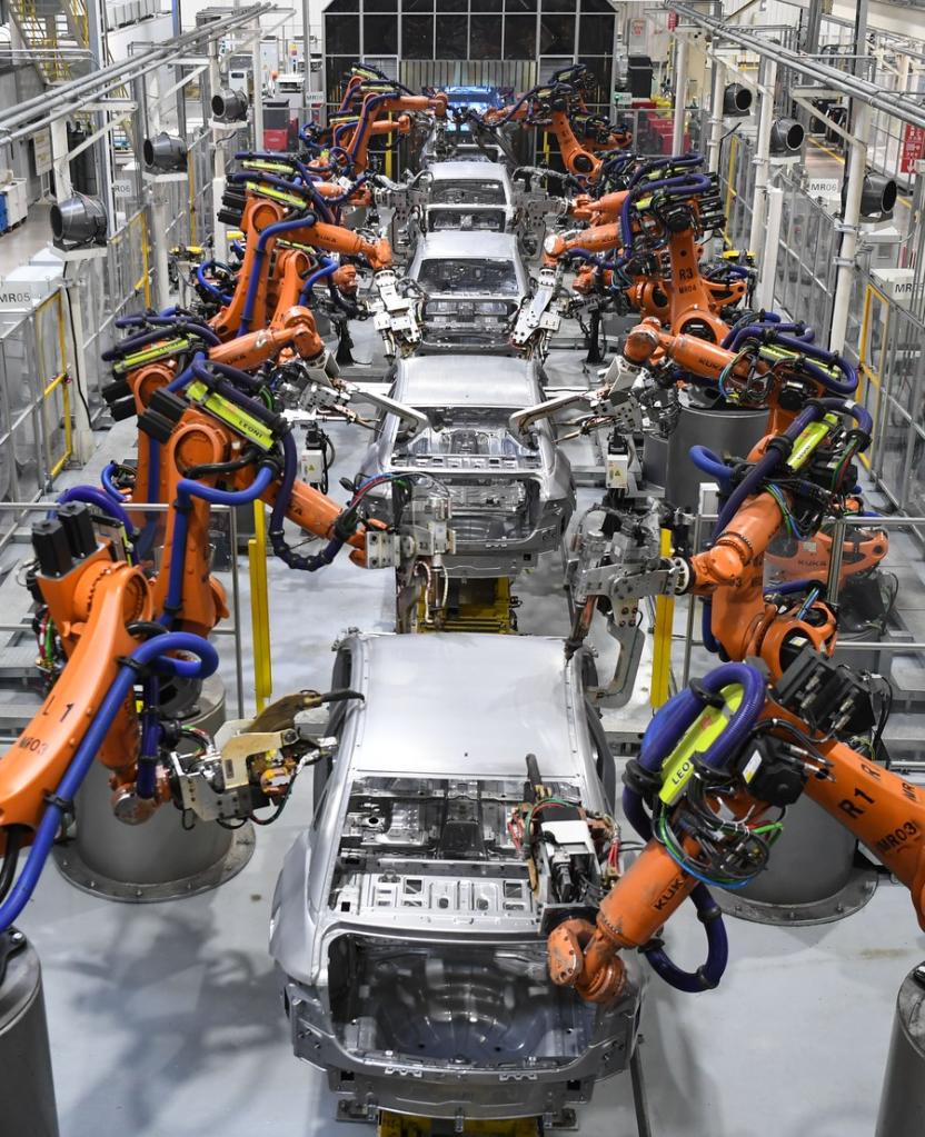 Robots realizan trabajo de soldadura en el taller de GAC Aion, una filial de la compañía Guangzhou Automobile Group Co., Ltd. (GAC Group), en Guangzhou, provincia meridional china de Guangdong, el 24 febrero de 2023. (Xinhua/Deng Hua)