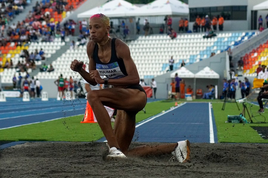 La atleta venezolana Yulimar Rojas compite en la prueba femenina de triple salto en el Estadio Nacional Jorge "El Mágico" González, en el departamento salvadoreño de San Salvador, el 5 de julio de 2023, durante los Juegos Centroamericanos y del Caribe de San Salvador 2023. (Xinhua/Alexander Peña)
