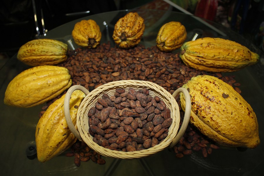 Imagen de archivo de granos de cacao exhibidos durante el VIII Salón del Cacao y Chocolate 2017, en el Centro de Convenciones de Lima, en el distrito de San Borja, Lima, Perú, el 6 de julio de 2017. (Xinhua/Luis Camacho)