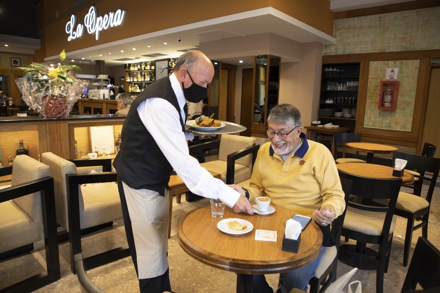 Jorge Valenzuela (i), camarero con 46 años de antigüedad, sirve un café a un comensal durante el día de reapertura del bar La Opera, en la ciudad de Buenos Aires, Argentina, el 11 de mayo de 2022. La Opera, el histórico bar fundado en 1928, reabrió sus puertas el miércoles luego de permanecer cerrado por reformas durante seis meses, con un ambiente que evoca sus comienzos hace poco menos de 100 años. (Xinhua/Martín Zabala)