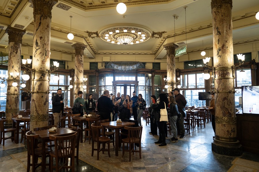 Personas visitan el salón principal de la Confitería del Molino durante una visita guiada para mostrar los avances de su restauración previo a su 107 aniversario, en la ciudad de Buenos Aires, capital de Argentina, el 4 de julio de 2023. (Xinhua/Martín Zabala)