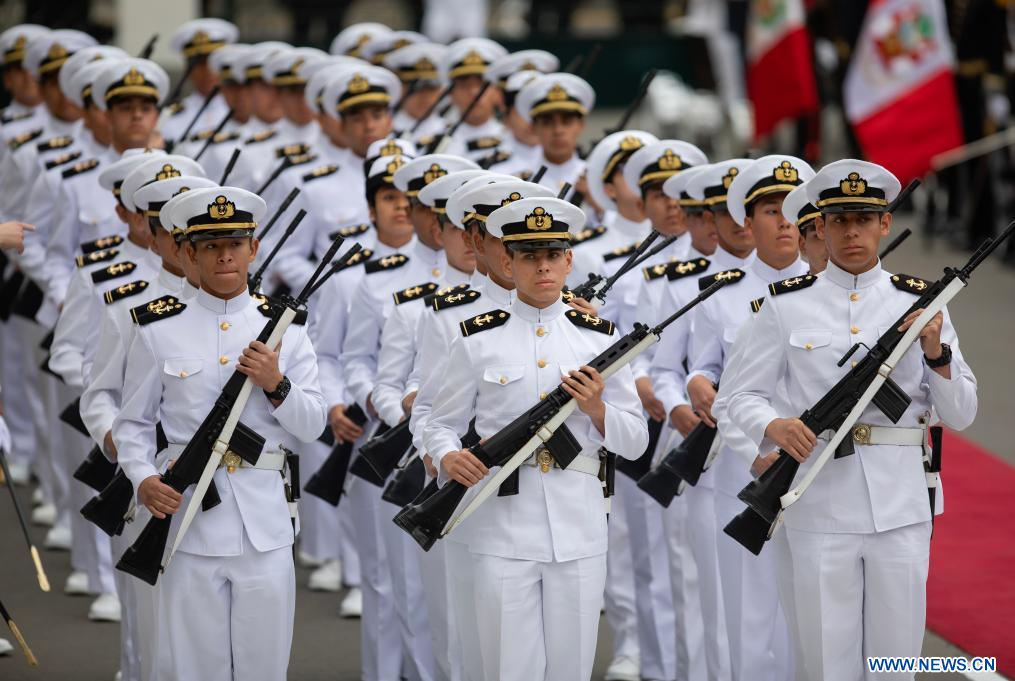 LIMA, 28 julio, 2023 (Xinhua) -- Elementos de la Marina peruana participan en la ceremonia con motivo de la celebración de las Fiestas Patrias, en Lima, Perú, el 28 de julio de 2023. La presidenta de Perú, Dina Boluarte, propuso el viernes firmar un "pacto de reconciliación" para lograr la paz del país, que en los últimos días ha registrado nuevas movilizaciones sociales que mantienen como exigencia su renuncia y el cierre del Congreso. (Xinhua/Mariana Bazo)