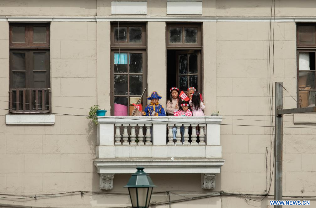 LIMA, 28 julio, 2023 (Xinhua) -- Personas observan desde un balcón la ceremonia con motivo de la celebración de las Fiestas Patrias, en Lima, Perú, el 28 de julio de 2023. La presidenta de Perú, Dina Boluarte, propuso el viernes firmar un "pacto de reconciliación" para lograr la paz del país, que en los últimos días ha registrado nuevas movilizaciones sociales que mantienen como exigencia su renuncia y el cierre del Congreso. (Xinhua/Mariana Bazo)