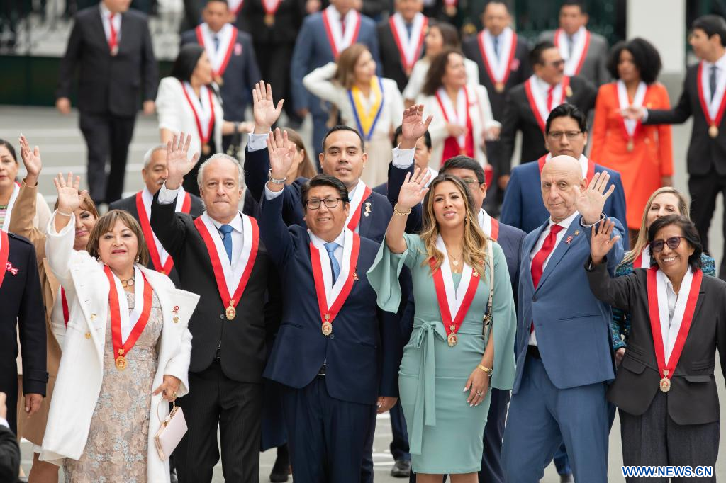 Congresistas llegan al Congreso de la República para participar en la ceremonia con motivo de la celebración de las Fiestas Patrias, en Lima, Perú, el 28 de julio de 2023. La presidenta de Perú, Dina Boluarte, propuso el viernes firmar un "pacto de reconciliación" para lograr la paz del país, que en los últimos días ha registrado nuevas movilizaciones sociales que mantienen como exigencia su renuncia y el cierre del Congreso. (Xinhua/Mariana Bazo)