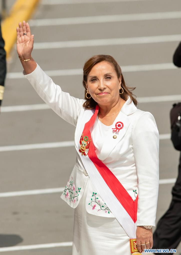 LIMA, 28 julio, 2023 (Xinhua) -- La presidenta peruana, Dina Boluarte, saluda a su llegada a la ceremonia con motivo de la celebración de las Fiestas Patrias, en Lima, Perú, el 28 de julio de 2023. Boluarte propuso el viernes firmar un "pacto de reconciliación" para lograr la paz del país, que en los últimos días ha registrado nuevas movilizaciones sociales que mantienen como exigencia su renuncia y el cierre del Congreso. (Xinhua/Mariana Bazo)
