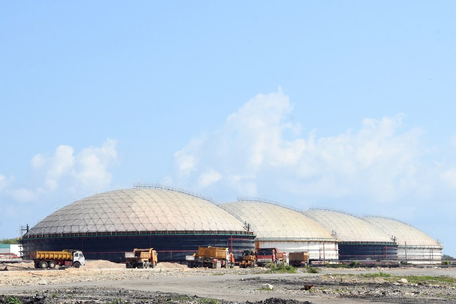 Imagen del 30 de marzo de 2023 de maquinaria durante la construcción de un depósito de petróleo en la Base de Supertanqueros de Matanzas, en la provincia cubana de Matanzas. (Xinhua/Joaquín Hernández)