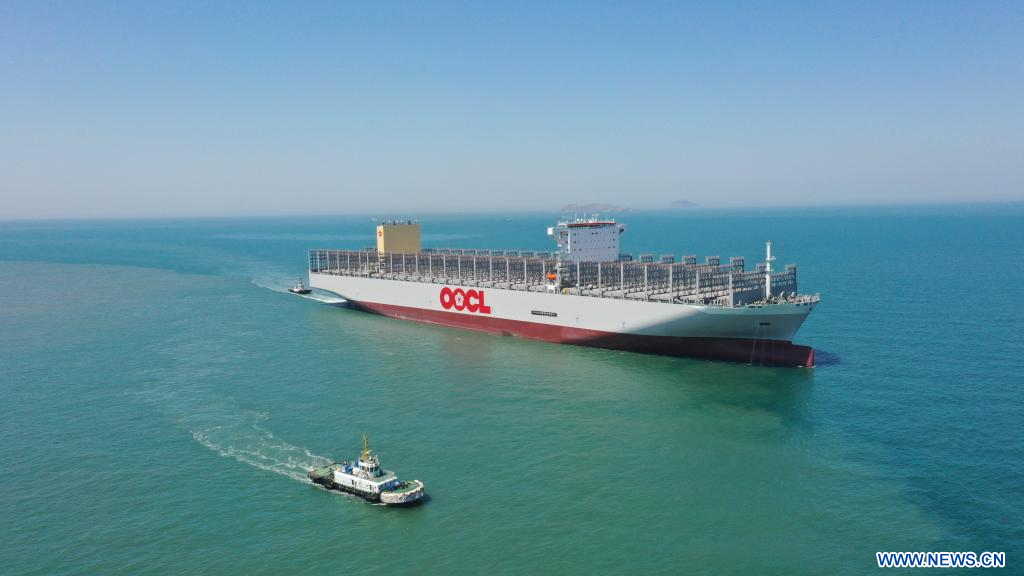 El buque portacontenedores ultra grande llamado "OOCL Felixstowe" en un viaje de prueba, en Dalian, provincia de Liaoning, en el noreste de China. (Xinhua/Dalian COSCO KHI Ship Engineering Co., Ltd.)