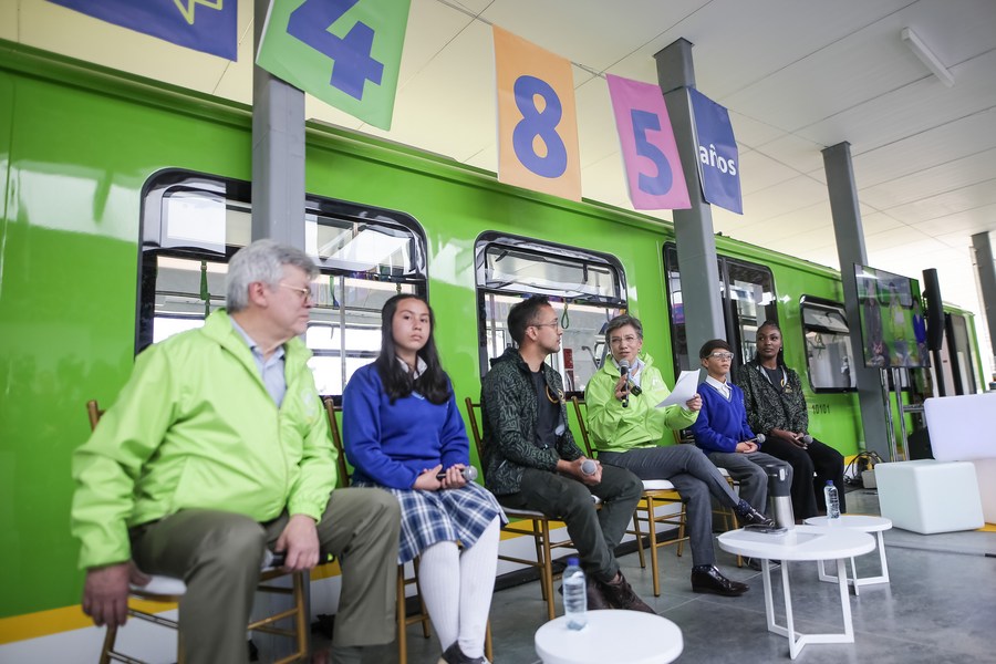 La alcaldesa de Bogotá, Claudia López (3-d), participa en la inauguración del Vagón Escuela de la Primera Línea del Metro, en Bogotá, Colombia, el 10 de agosto de 2023. (Xinhua/Str)