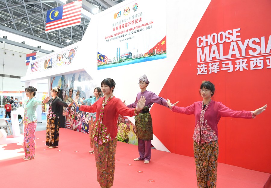 Se presenta danza malasia durante la inauguración del pabellón de Malasia de la 19ª Exposición China-ANSEA en Nanning, en la región autónoma de la etnia zhuang de Guangxi, en el sur de China, el 16 de septiembre, 2022. (Xinhua/Zhou Hua)