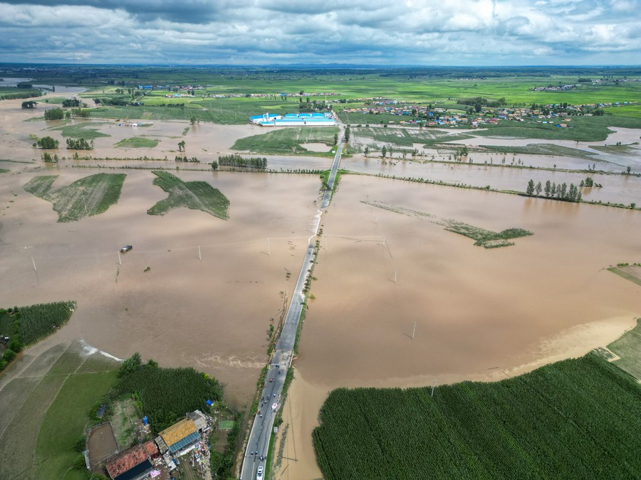Esta foto aérea, tomada el 5 de agosto de 2023, muestra un área afectada por las inundaciones en el poblado de Qili, de la ciudad de Shulan, en la provincia nororiental china de Jilin. (Xinhua/Yan Linyun)