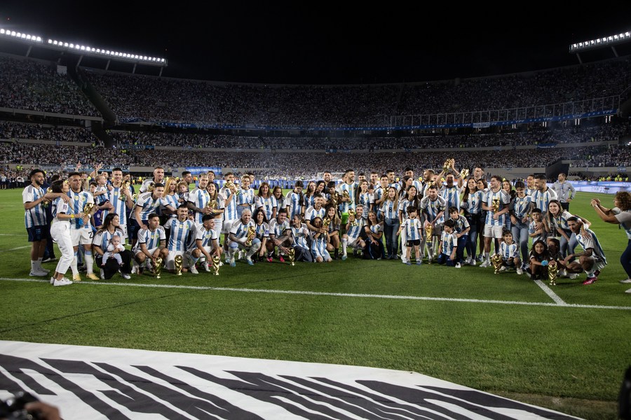 Imagen del 23 de marzo de 2023 de jugadores de la selección argentina de fútbol celebrando la consagración en el Mundial de Qatar ante aficionados argentinos al finalizar el partido amistoso ante Panamá, en el Estadio Monumental, en la ciudad de Buenos Aires, capital de Argentina. (Xinhua/Martín Zabala)